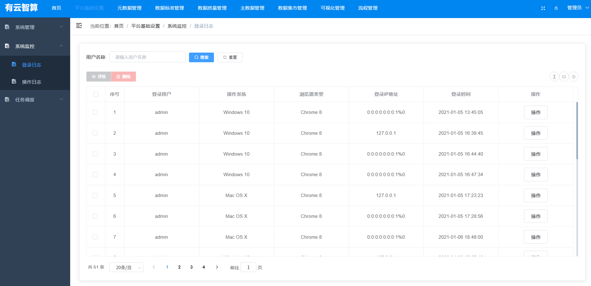 系统监控:登录日志、操作日志等行为审计;