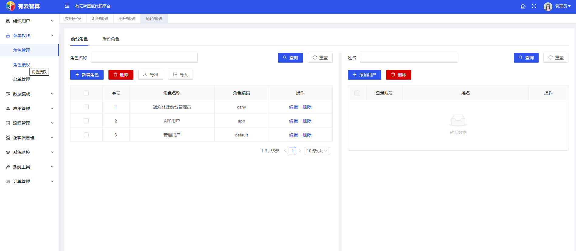 角色管理:配置前台/后台角色(如冠众能源前台管理员、APP 用户等),支持角色授权、用户关联等权限控制。