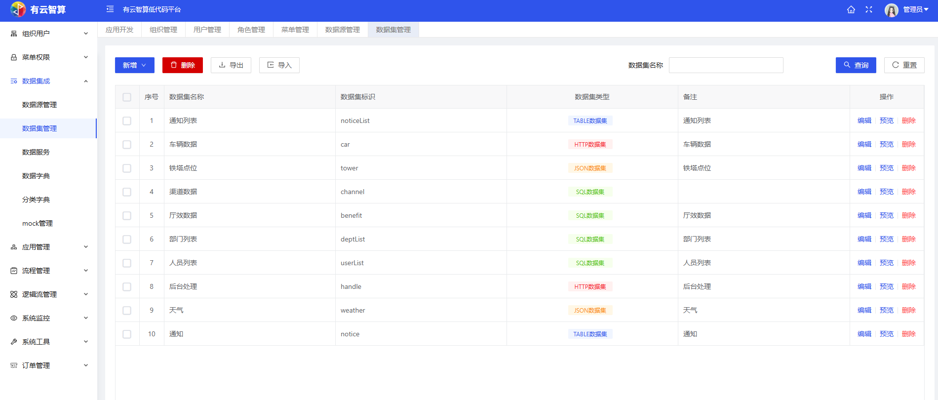 数据集管理:维护多种类型数据集(TABLE/HTTP/JSON/SQL等,如通知列表、车辆数据等),支持编辑、预览等操作。