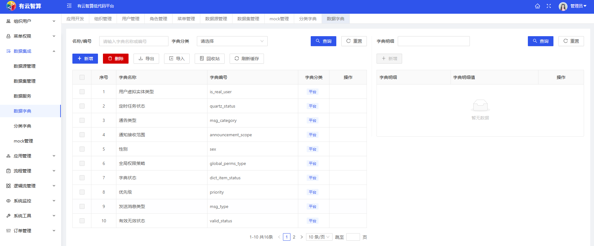 数据字典:管理系统通用数据字典(如用户虚拟类型、定时任务状态等),统一数据标准。