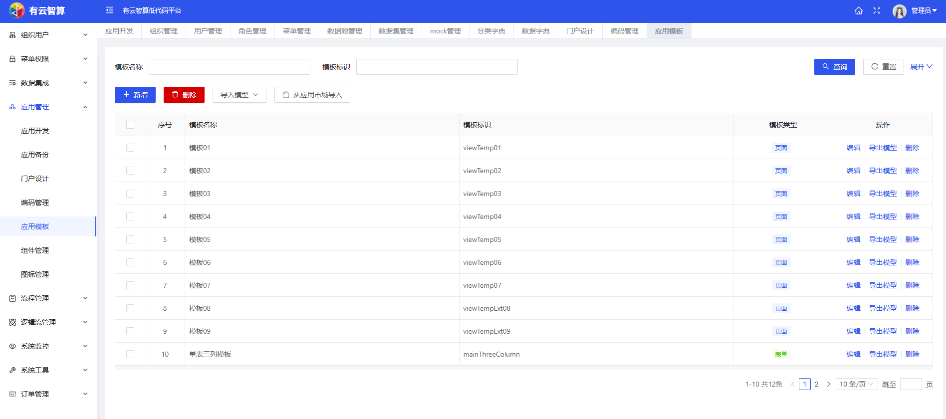 应用模板:提供页面 / 表单类模板(如模板01、单表三列模板等),支持模板编辑、导出,提升应用搭建效率。