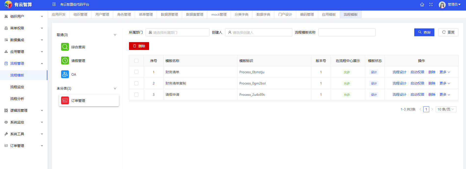 流程模板:设计流程模板(如财务清单、请假申请等),支持流程启动权限配置、流程设计等操作。