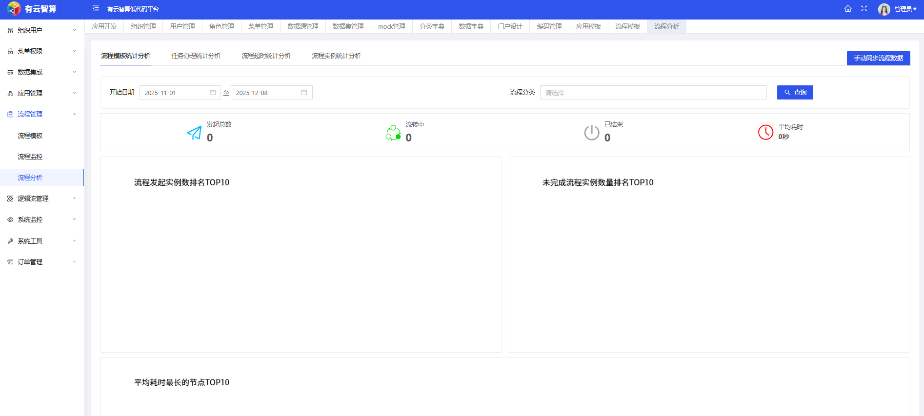 流程监控/分析:监控流程状态,统计流程发起、流转、耗时等数据(如流程发起总数、平均耗时等),辅助流程优化;同时支持逻辑流编排(如订单下达逻辑流)。