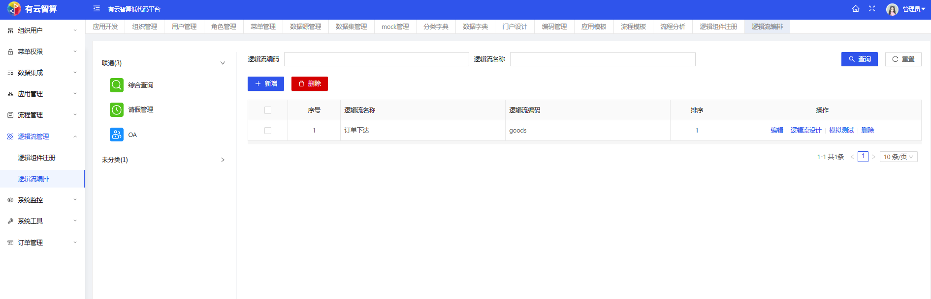 应用开发:创建 / 导入应用(如综合查询、请假管理、OA等),支持应用分类(联通、test 等分类)管理。