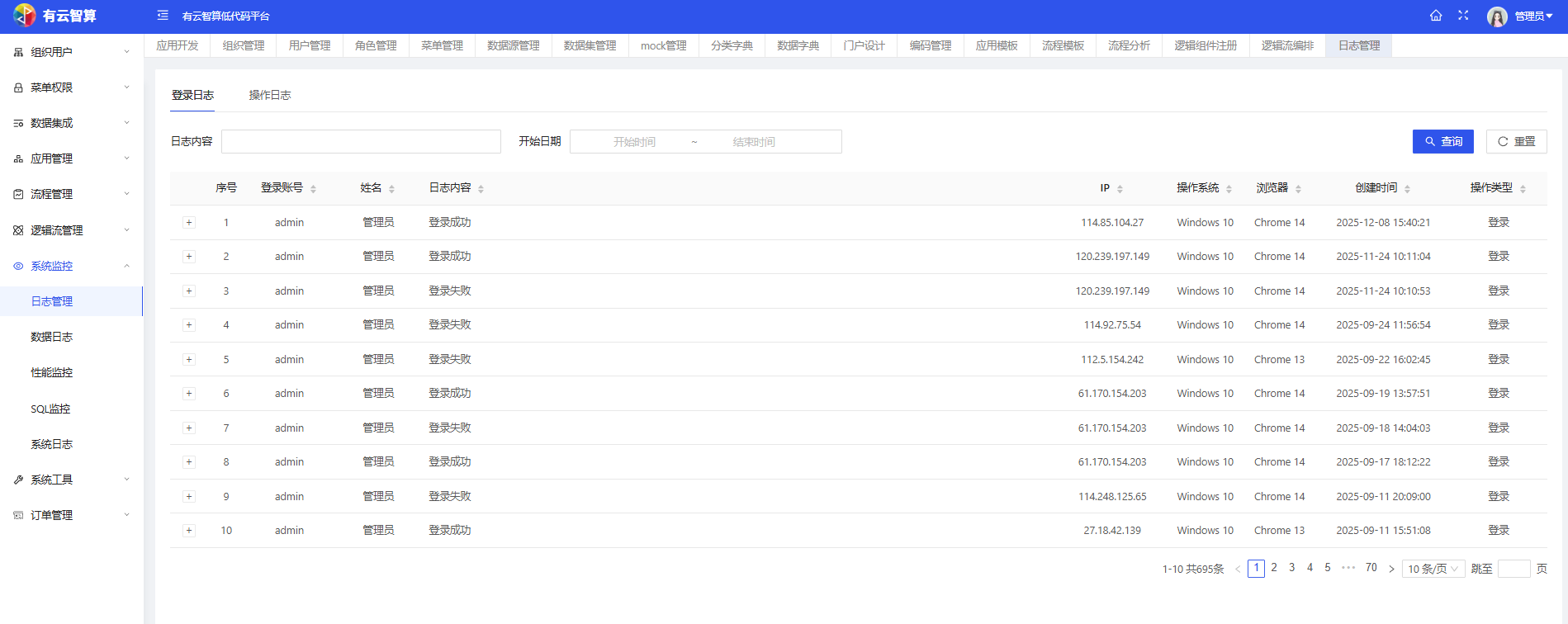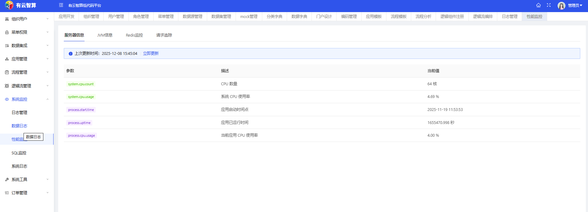 系统监控:支持日志管理(登录日志、操作日志等)、性能监控(服务器CPU、应用运行时间等信息)、SQL监控等。