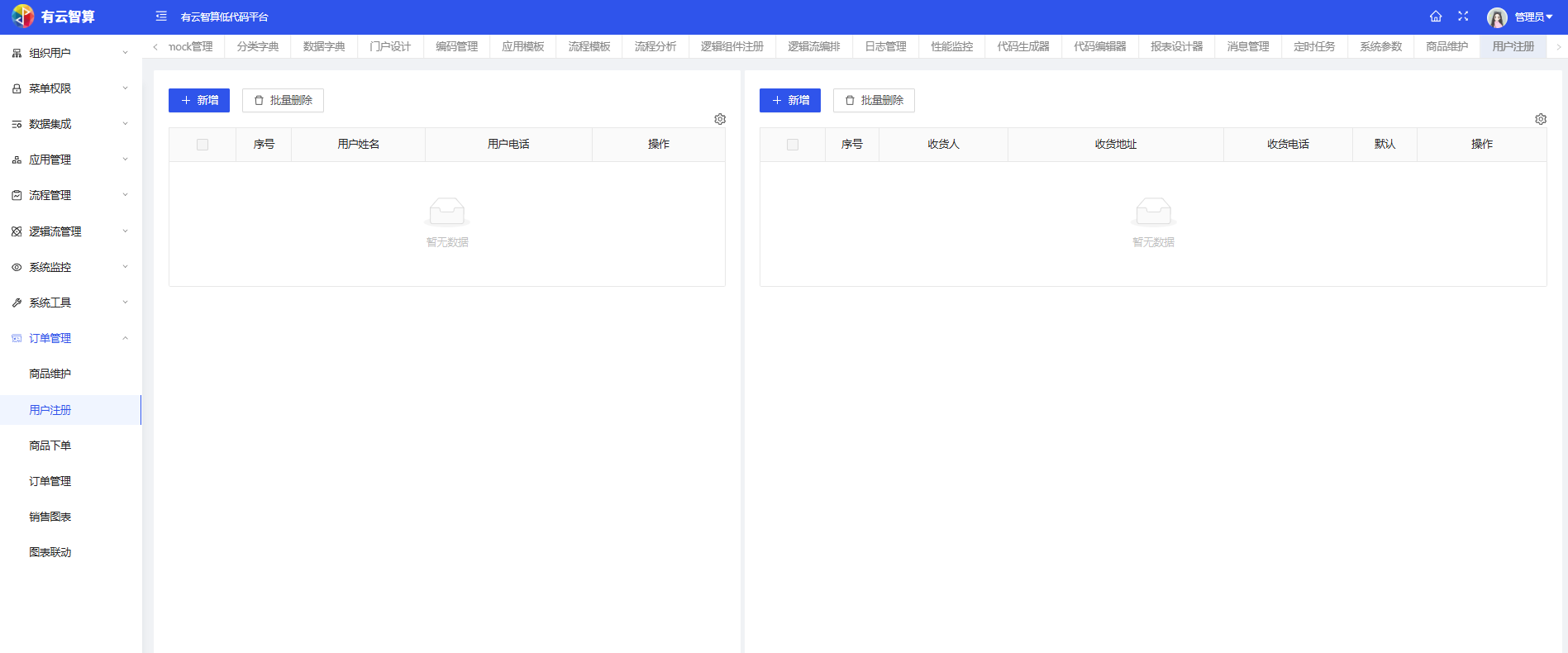 组织管理:维护企业组织架构(如低代码管理平台、研发部等部门/子组织),支持新增、导入导出、新增下级等操作。