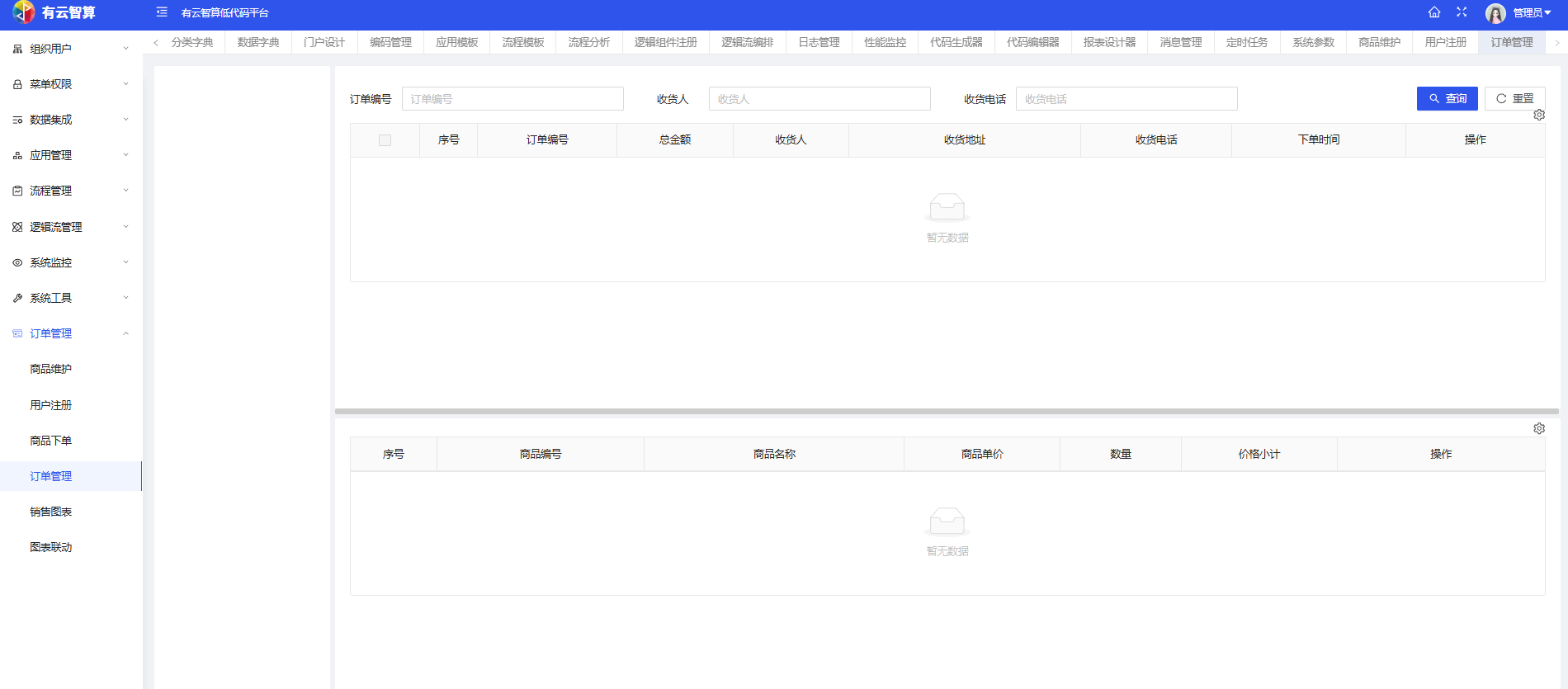 订单管理:支持商品维护、用户注册、商品下单、订单管理(订单编号、收货人等信息)、销售图表、图表联动等订单类业务管理。
