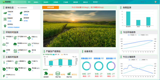 支持虫情自动预警、设备运维状态监控和产量预测分析,系统赋能田间管理与生产决策,实现基地运营数字化和风险防控能力大幅提升。