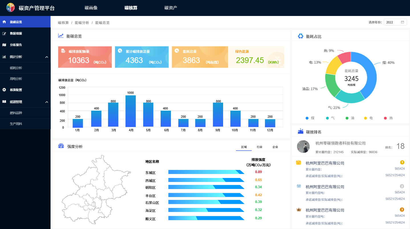 (二)碳画像管理:展示企业碳排放强度、碳效评分、行业排名等信息,结合碳排放趋势、能源消耗结构等数据,构建企业碳管理画像。