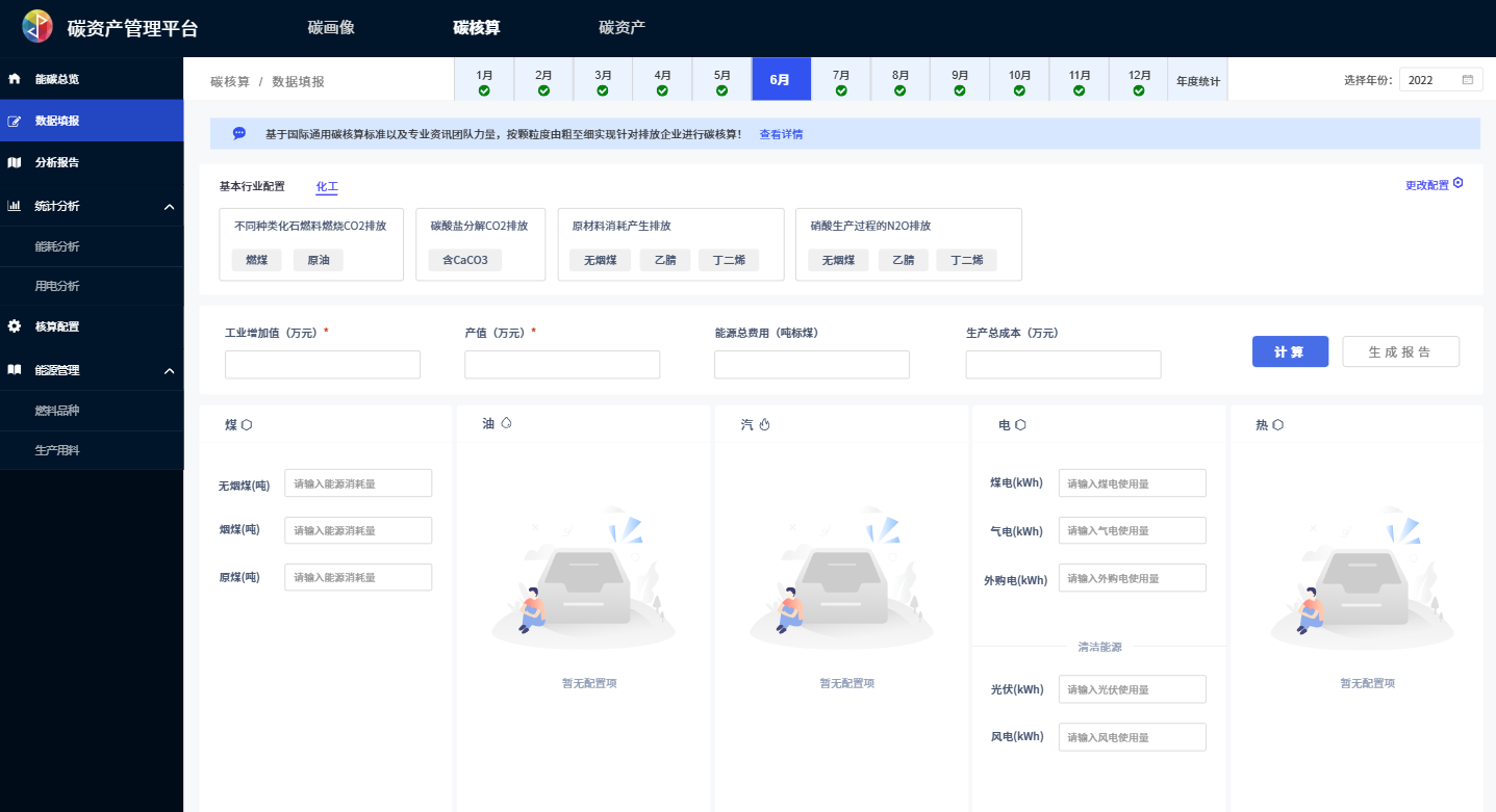 (三)数据填报:按行业配置碳排放因子(如化石燃料燃烧、原材料消耗等),支持煤、油、电等能源消耗量的月度填报,自动计算碳排放数据并生成报告。