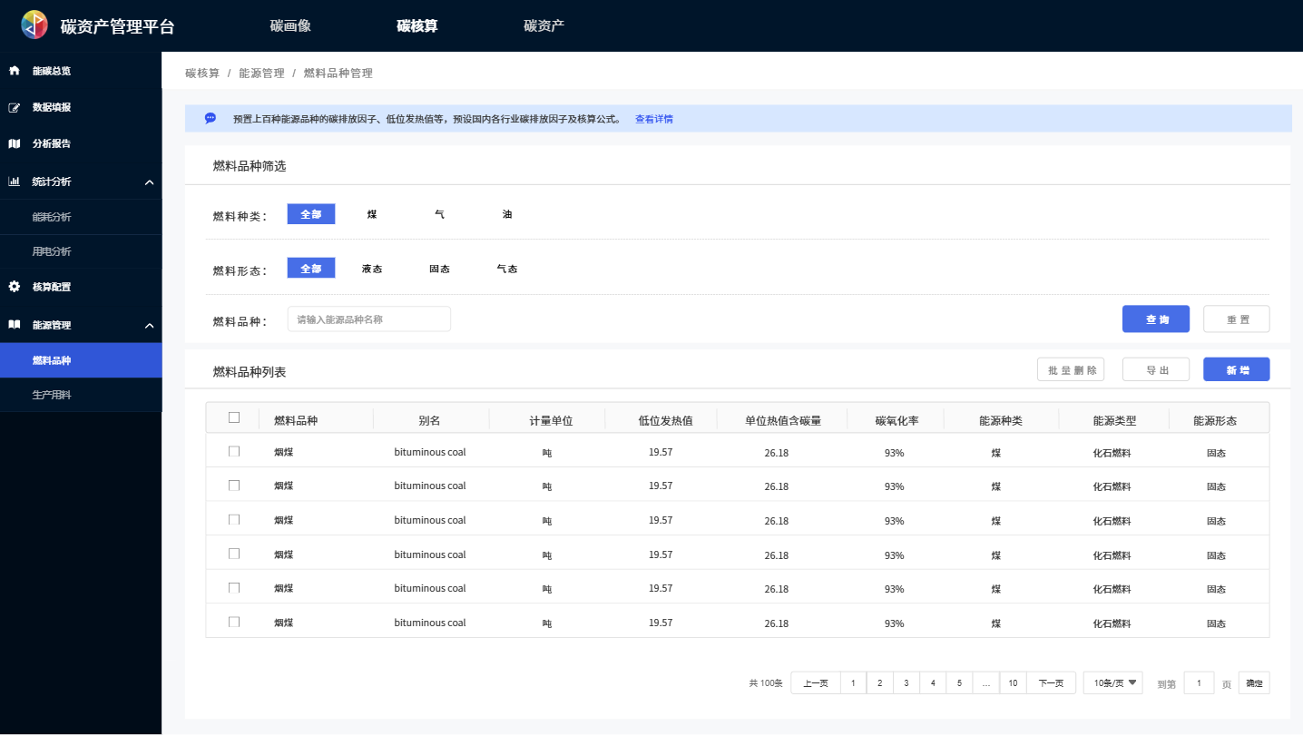 (七)能源管理:管理燃料品种(如煤、气、油)的基础信息(热值、碳氧化率等),维护生产用料的排放因子,标准化能源与物料的碳核算基础数据。