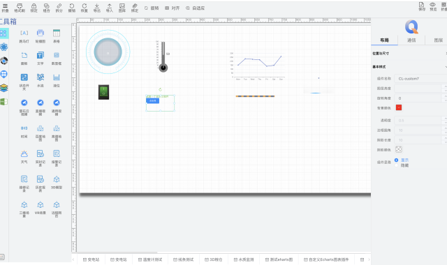 系统支持精确布局、图层管理与组件联动,可设置旋转角度、透明度、边框圆角、阴影等样式属性,并通过右侧通信面板实现变量绑定与数据交互。 设计完成后可一键保存、预览或发布,实现“零代码构建 + 动态可视化”的业务监控体验。