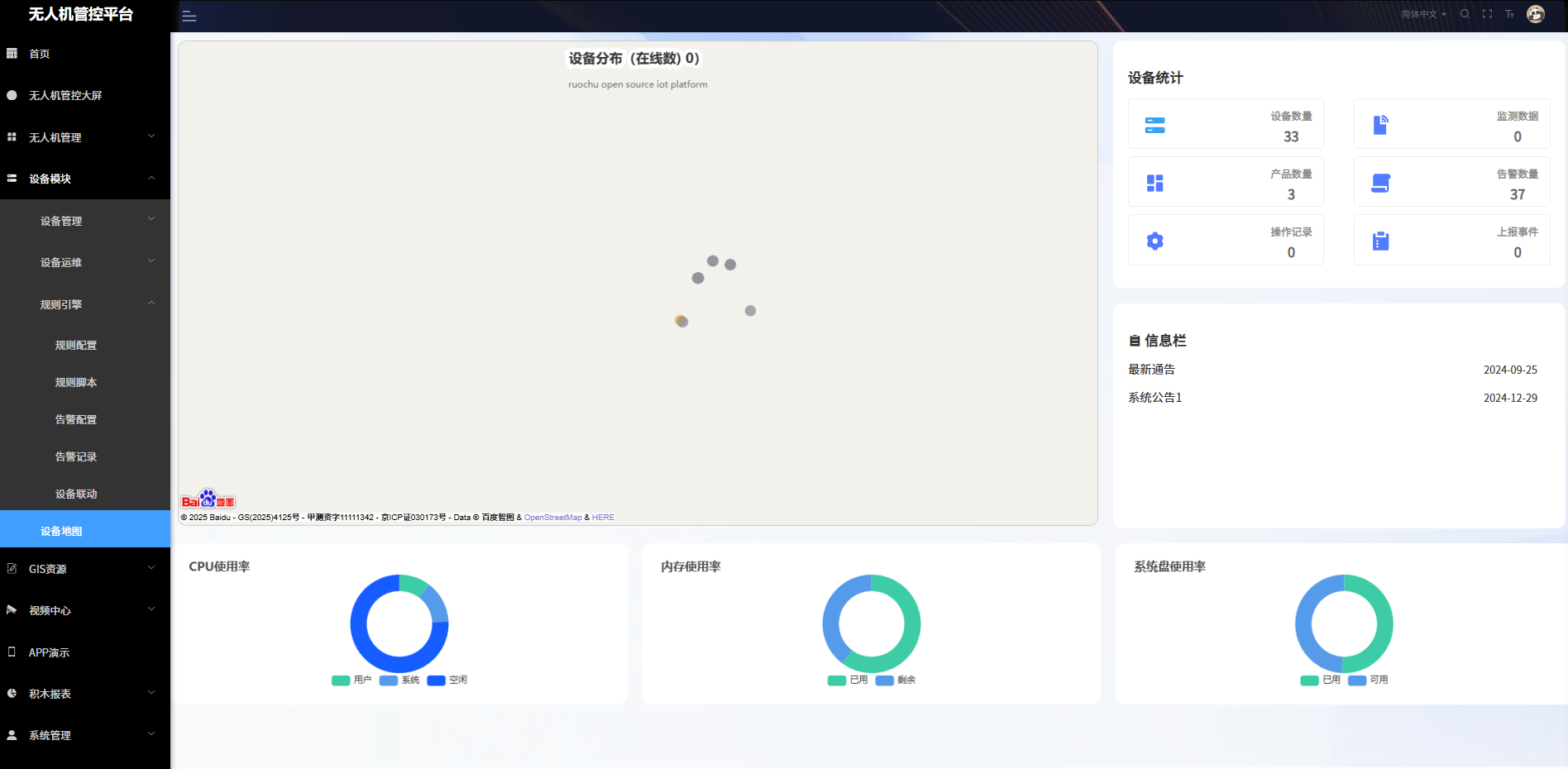 平台广泛适用于无人机管控后台管理、系统运维、基础能力支撑,以及设备监控、区域巡检等场景。通过配置与数据的双向联动,实现系统功能灵活适配、操作行为可追溯、通信状态可监控;同时凭借多维度数据看板支撑决策,达成无人机状态实时掌握、告警及时处置、资源合理调度的目标,全面提升无人机设备管控与运维管理效能。