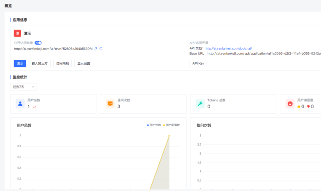平台支持多种访问方式与权限控制,提供API密钥管理、访问统计、使用日志与满意度反馈等监控能力,帮助企业实时掌握AI应用运行状态与交互质量。