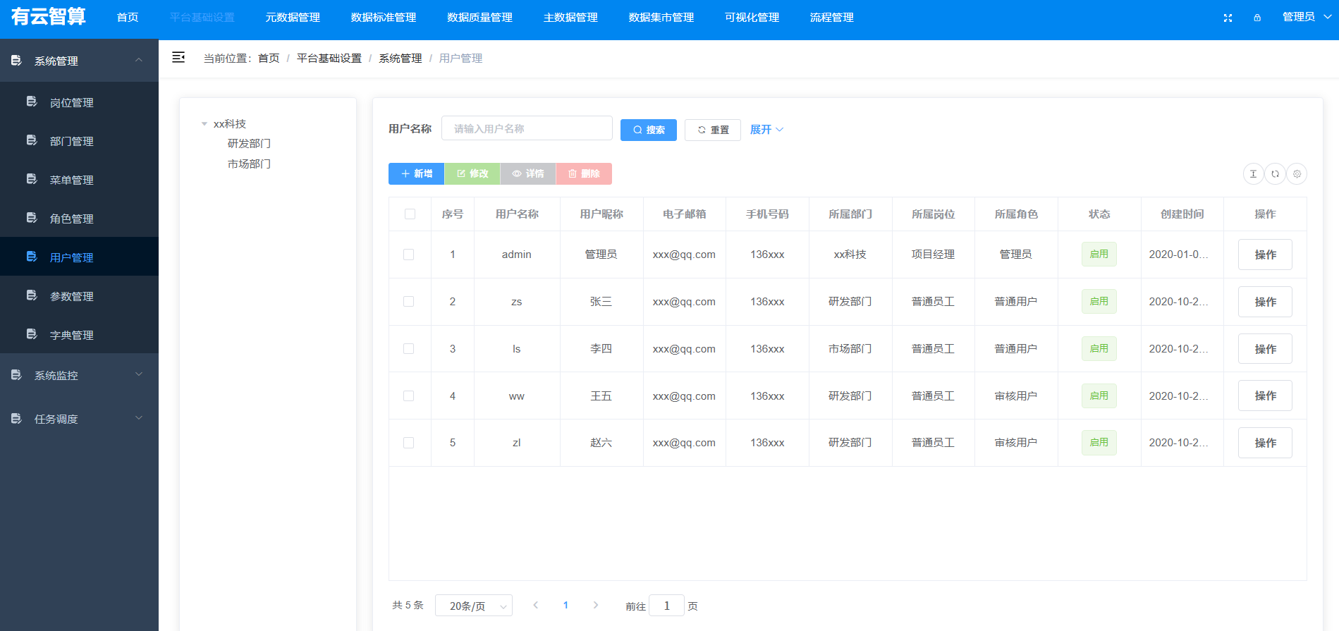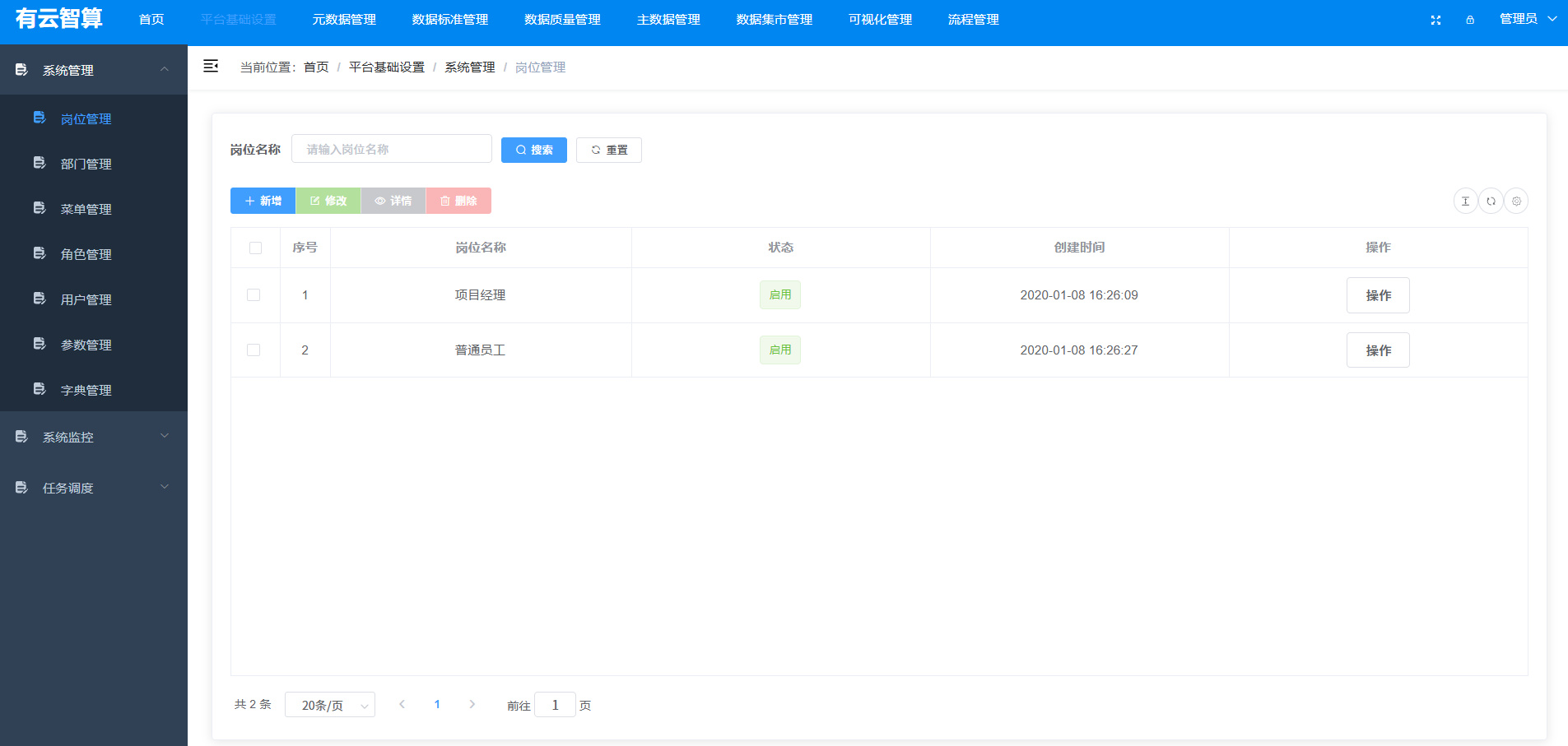 系统管理:岗位、部门、菜单、角色、用户等组织权限配置(如岗位管理、用户管理);