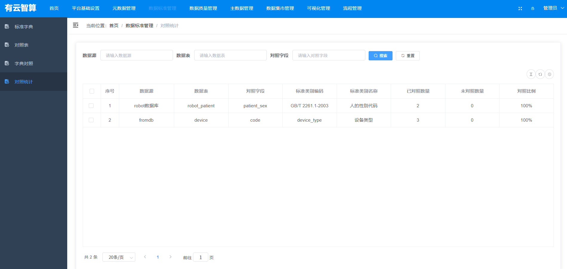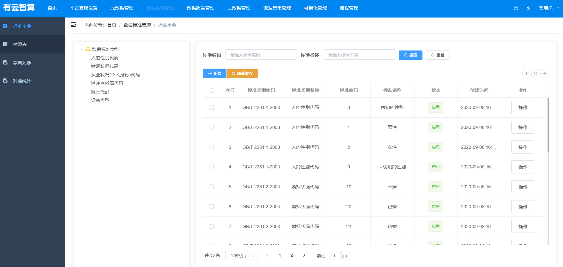 数据标准管理:标准字典(如性别、婚姻状况等标准化编码)、对照表、字典对照等数据规范管理;
