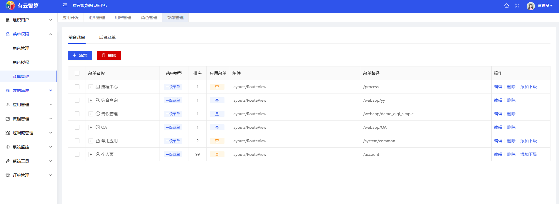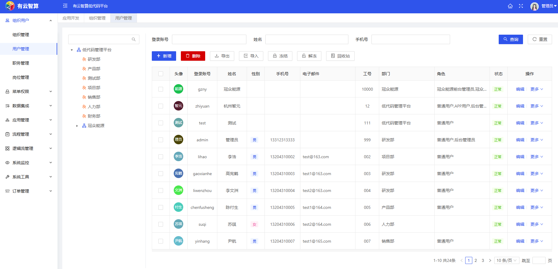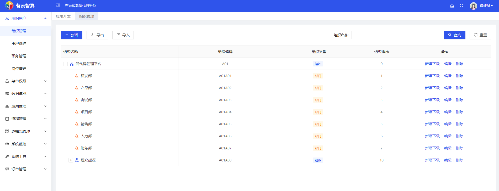 组织管理:维护企业组织架构(如低代码管理平台、研发部等部门/子组织),支持新增、导入导出、新增下级等操作。