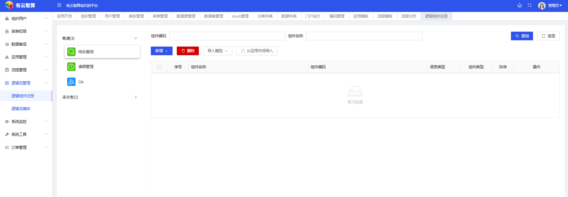应用开发:创建 / 导入应用(如综合查询、请假管理、OA等),支持应用分类(联通、test 等分类)管理。