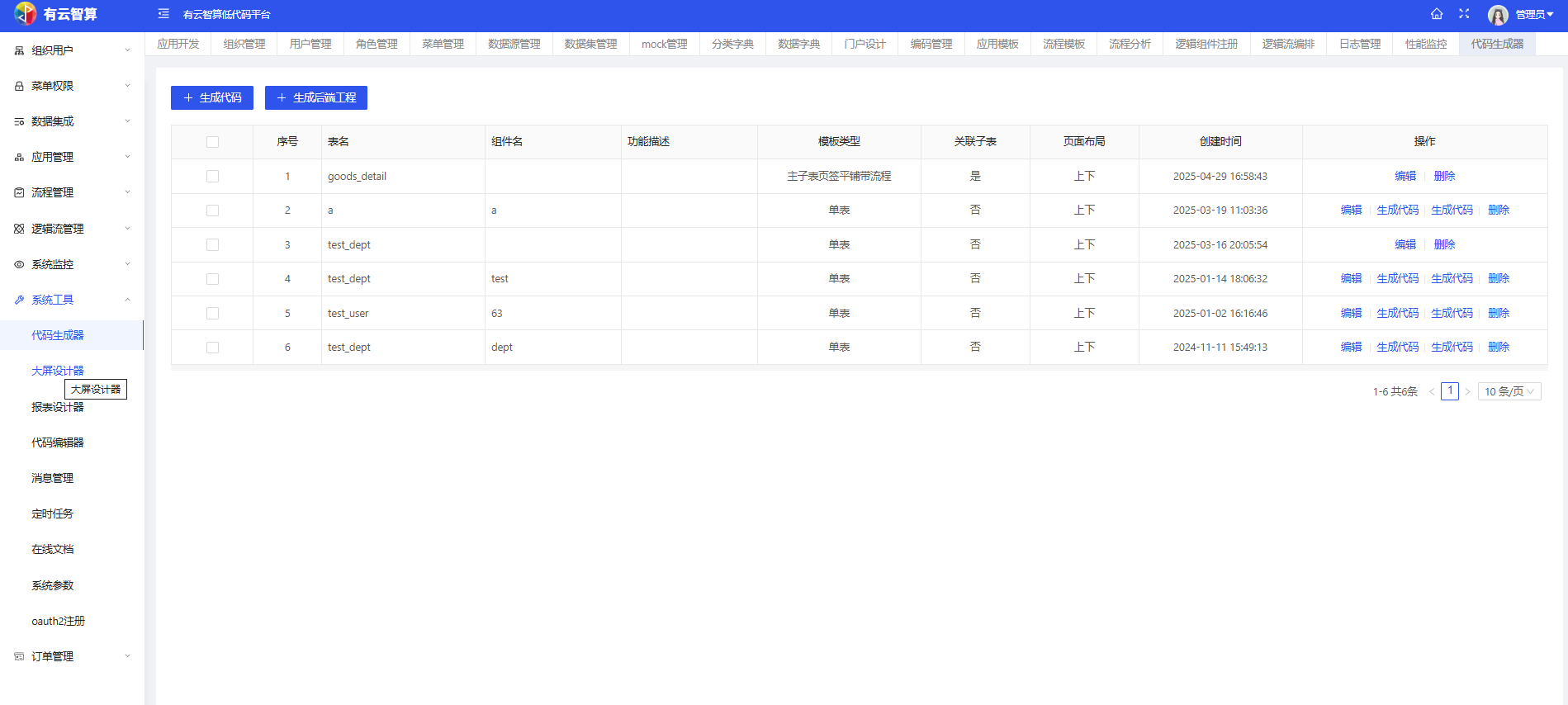 系统工具:提供代码生成器(生成代码、生成后端工程)、大屏设计器、报表设计器、消息管理、定时任务、系统参数配置(如默认密码、系统LOGO等)等工具。