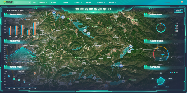 平台融合地图与多维数据,覆盖作物产量、种植面积、灌溉用水、设备状态、气象环境等关键业务信息,实现全区域智能协同管理。