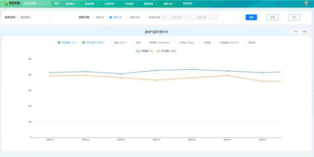 平台支持用户对单一基地气象环境进行细致分析,包含环境温度、空气湿度等多项数据,并可快速切换时间范围。