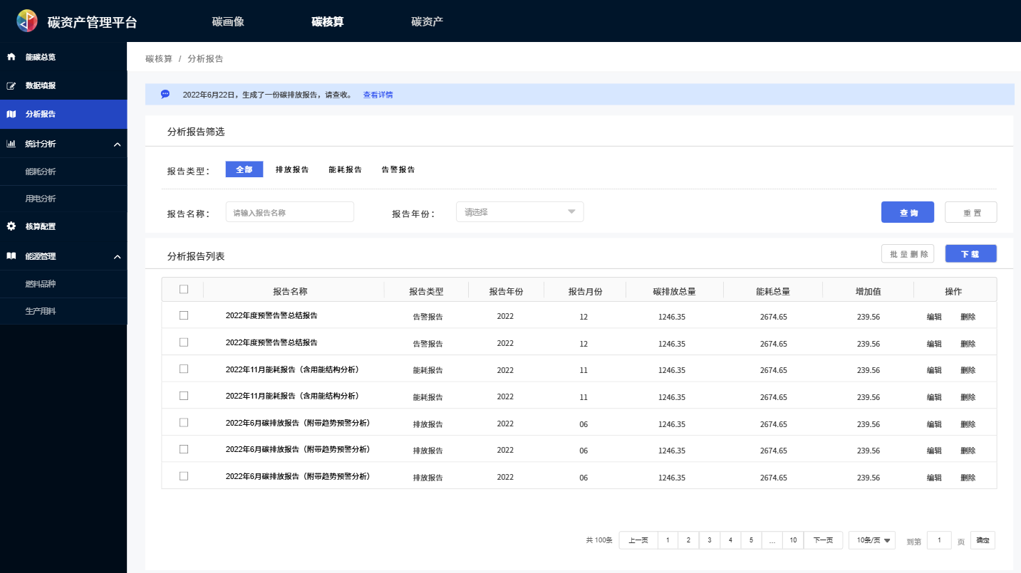 (四)分析报告:支持排放、能耗、告警等多类型报告的筛选、查询与下载,留存企业碳管理全周期的统计文档。