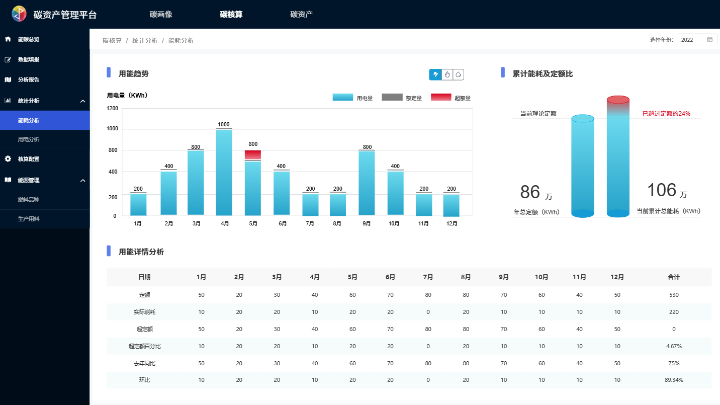 (五)统计分析:通过用能趋势、累计能耗定额比、用能详情等模块,对比能耗定额与实际消耗,分析超定额占比、同比 / 环比变化,辅助节能决策。