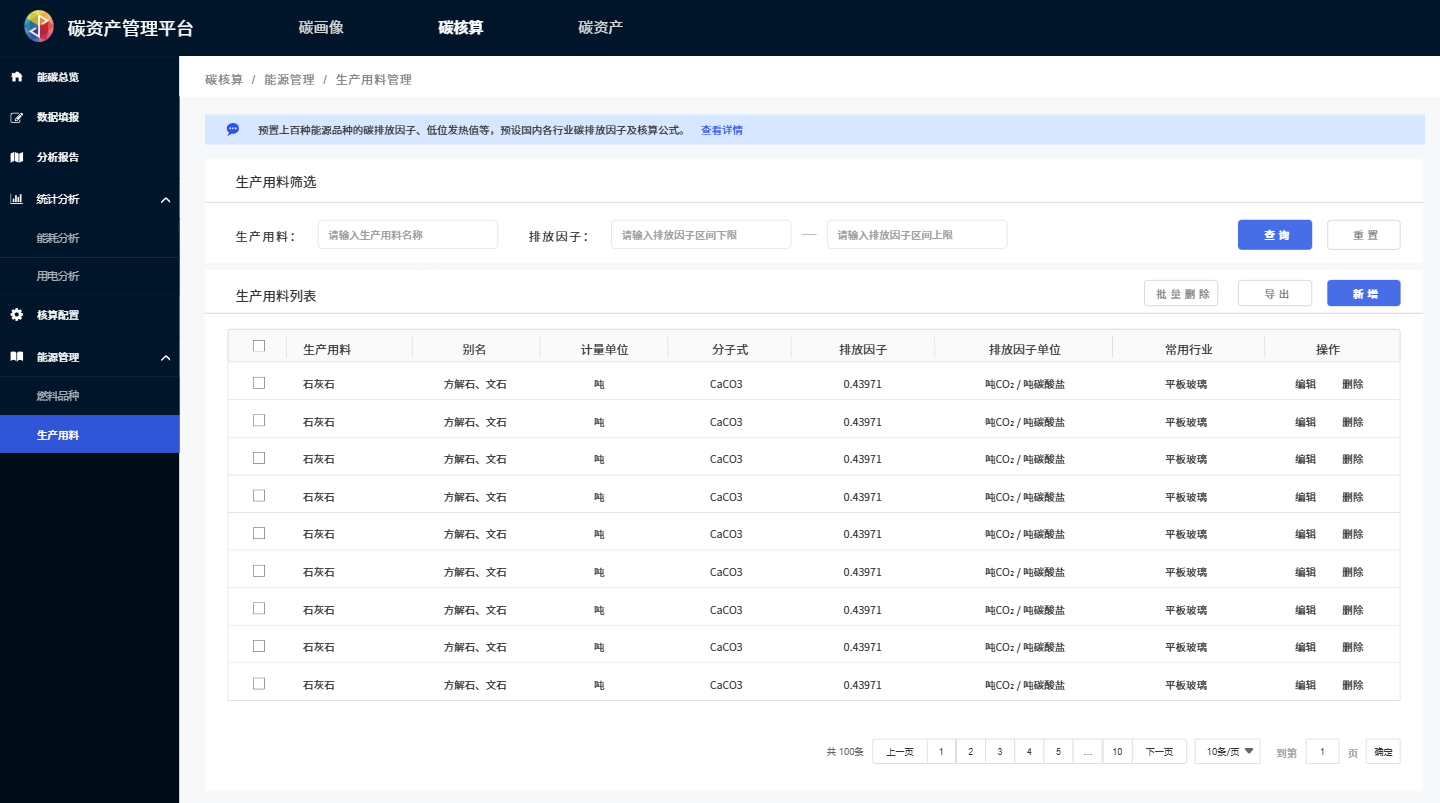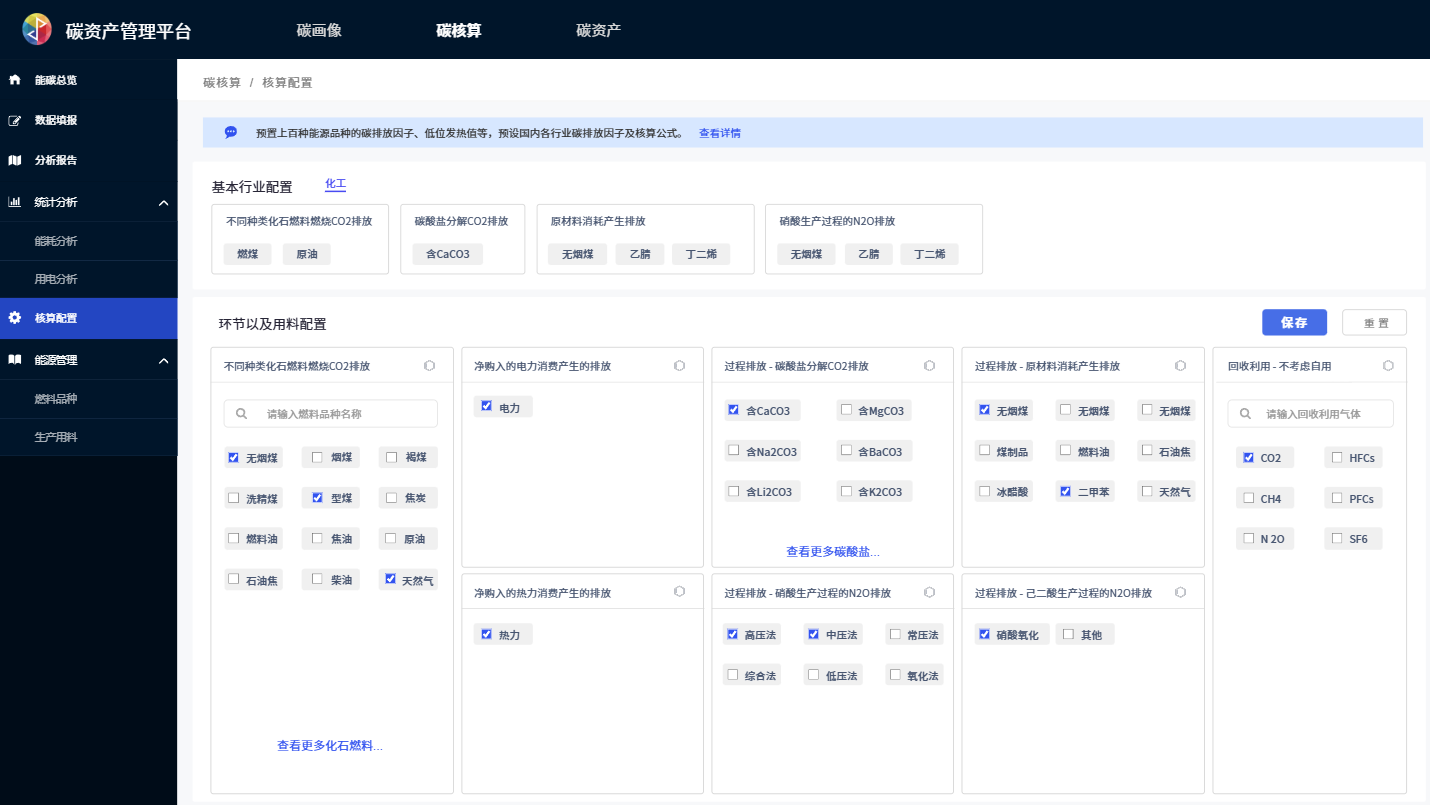 (六)核算配置:预设多行业碳排放因子及核算公式,支持燃料种类、生产用料等环节的排放因子自定义配置,适配不同企业的碳核算规则。