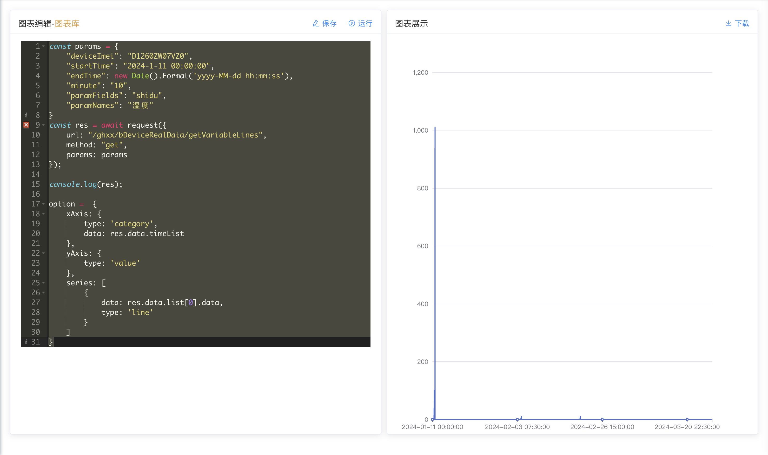 编辑器支持多类型图表(折线图、柱状图、饼图、雷达图等),可绑定变量并自定义时间维度、刷新频率与样式参数。右侧实时预览窗口同步显示图表渲染结果,便于调试与效果校验。