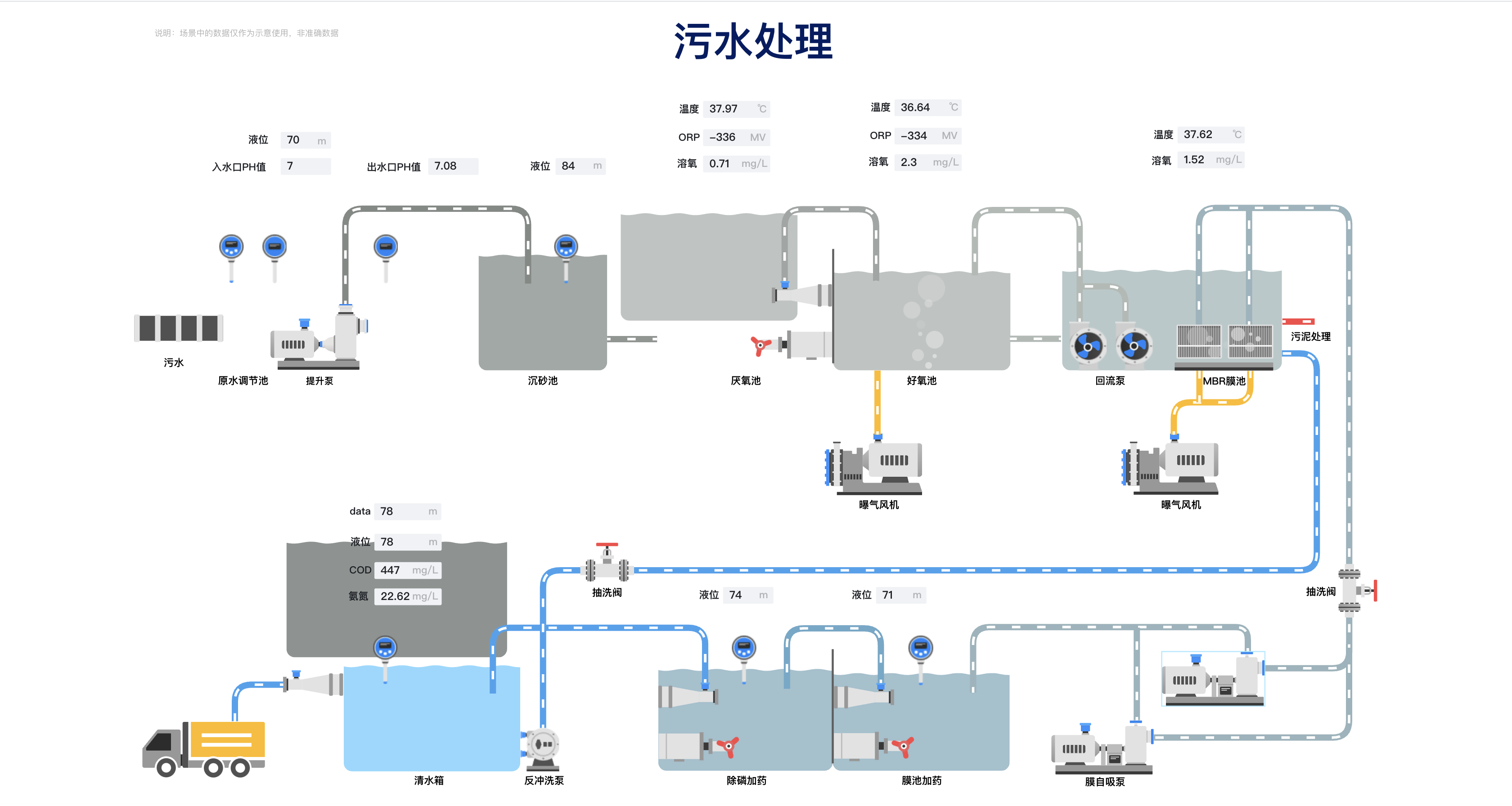 系统基于工业物联网与数字孪生技术,用户通过组态模拟设计,在界面上构建从污水收集、沉淀、曝气、生化处理到出水排放的全流程智能监控体系。支持实时采集液位、流量、pH值、溶氧、温度等关键指标数据,实现污水处理工艺的全自动调节与动态可视化。