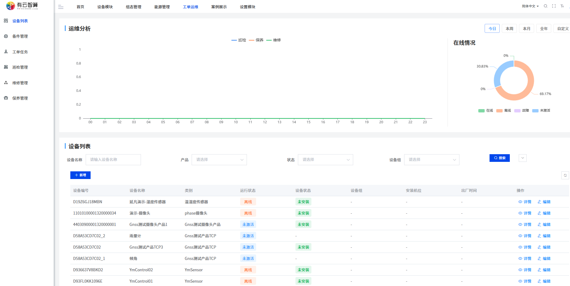 支持设备运维(故障报修、维修、保养)、备件管理(新增、领用、采购、出入库)等全流程操作;