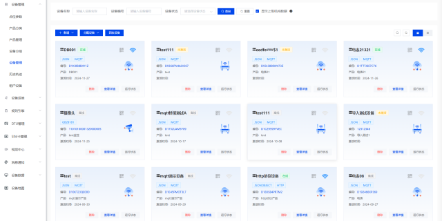 设备管理模块支持设备全生命周期管理,包括状态监控、分类管理、详细信息查询及在线/离线分组展示。