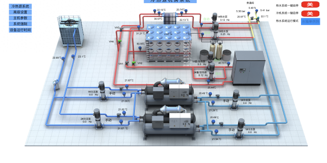 组态管理以3D工艺流程图展现冷热源主机房的管道、设备、阀门等实时状态,支持参数监控、设备控制、运行模式切换。